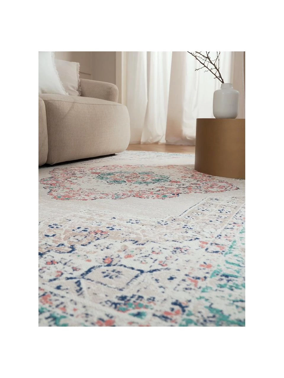 Der Teppich verleiht durch sein besonderes Vintage-Muster und den schönen Farben jedem Zuhause einen besonderen Charme.