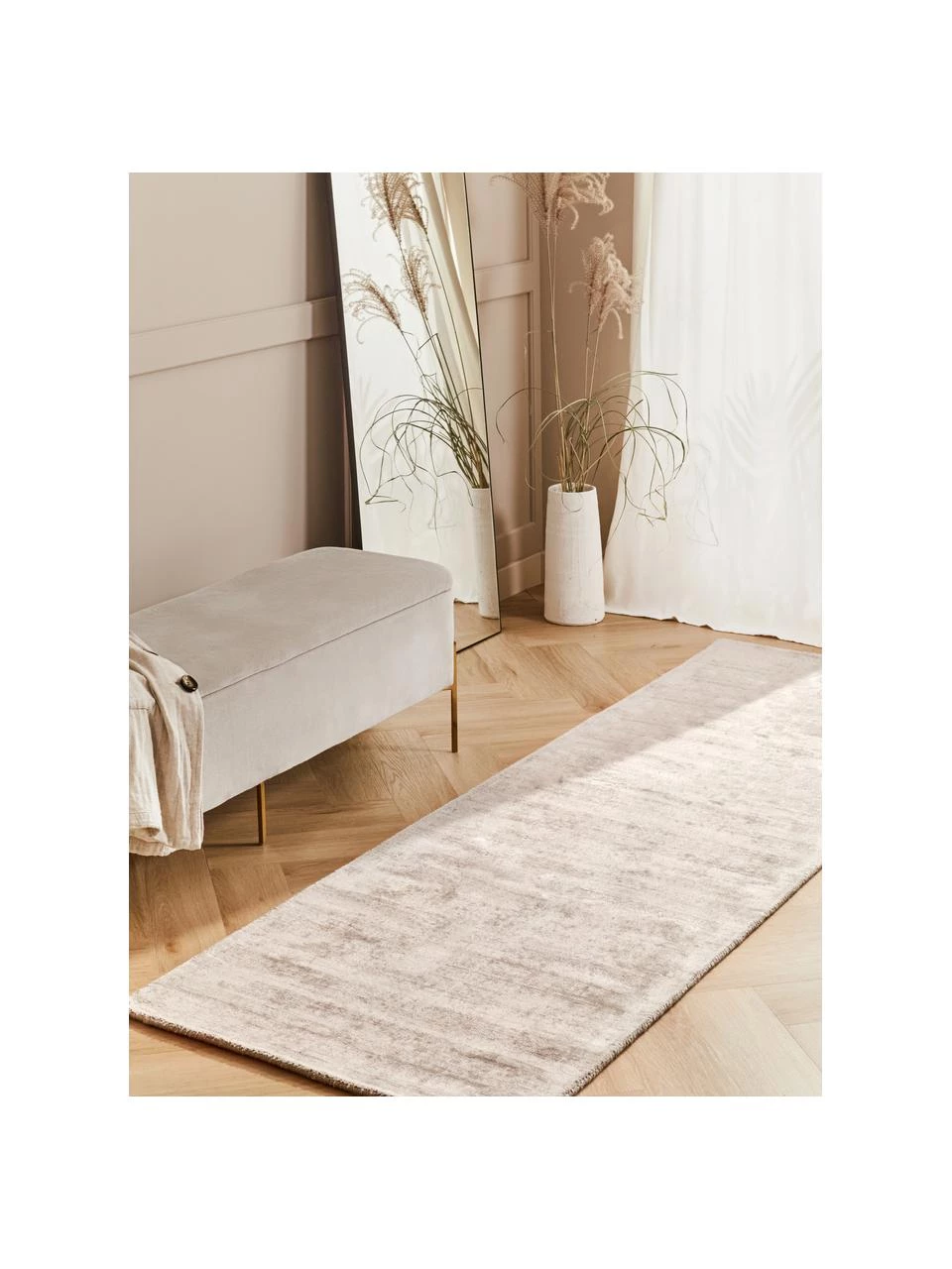 Bitte berücksichtigen Sie, dass Viskoseteppiche je nach Lichteinfall und Richtung, in der der Flor liegt, farblich heller oder dunkler scheinen.